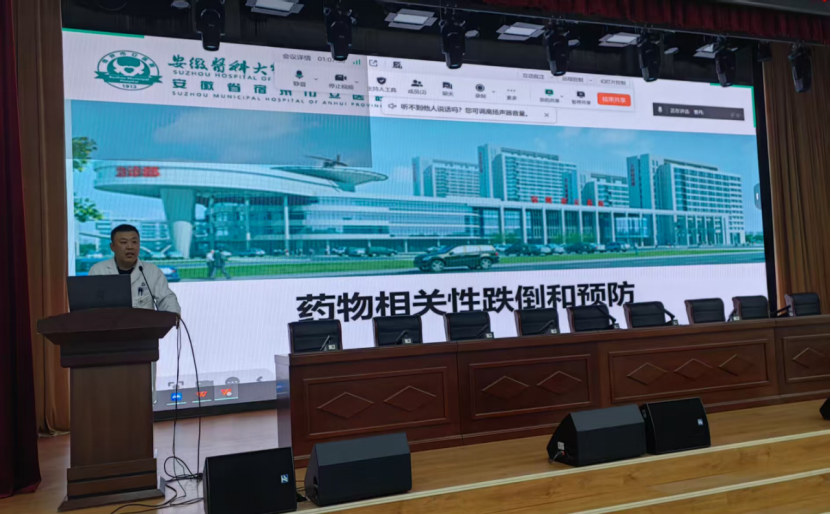 随后,药剂科刘洪峰主任紧密围绕“降低住院患者跌倒重度伤害率专项行动”的要求,以“药物相关性跌倒风险与预防”为题进行了精彩分享。刘主任从药理学角度出发,系统梳理了可能导致跌倒风险增加的药物种类,如镇静催眠药、降压药、降糖药、利尿剂等,并详细分析了其作用机制与风险发生的时间点。他提出,临床医护人员应加强对患者用药史的评估,特别是对于服用多种高风险药物的患者,需提高警惕,加强用药指导与健康宣教,同时结合环境改造和个性化护理措施,从源头上降低药物相关性跌倒的风险。刘主任的分享视角独特,为临床跌倒预防工作提供了全新的思路和具体的指导建议。