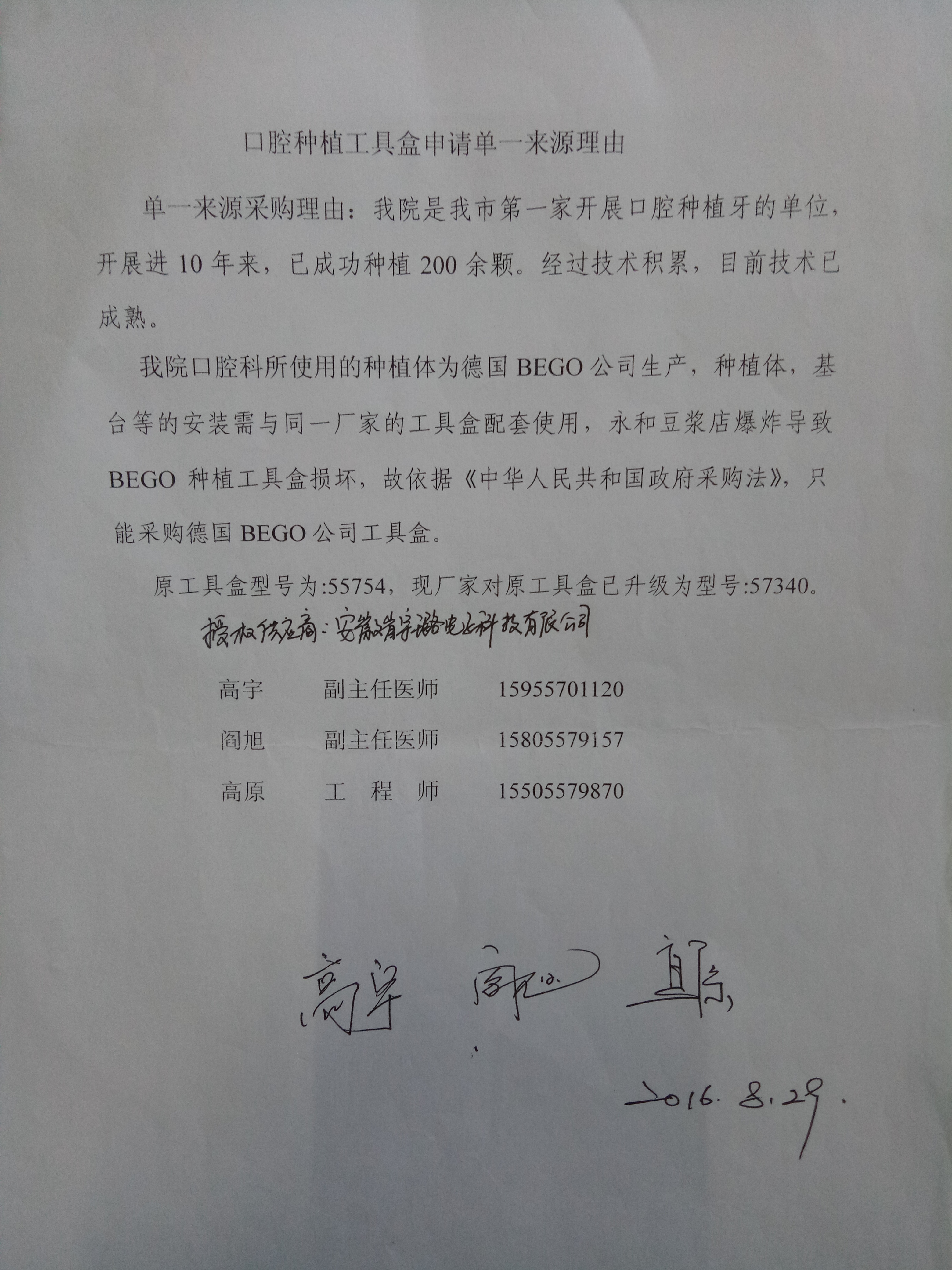 单一来源采购原因:宿州市立医院口腔科所使用的种植体为德国BEGO公司生产,种植体、基台等的安装需要与同一厂家的工具盒配套使用,且因为宿州市立医院医院需速购该设备,根据政府采购法第三十一条第一款,故要求采用单一来源方式进行采购。