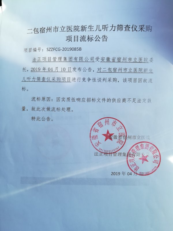 法正项目管理集团有限公司受安徽省宿州市立医院委托,2019年04月10日发布公告,对二包宿州市立医院新生儿听力筛查仪采购项目进行竞争性谈判采购,该项目因故流标。