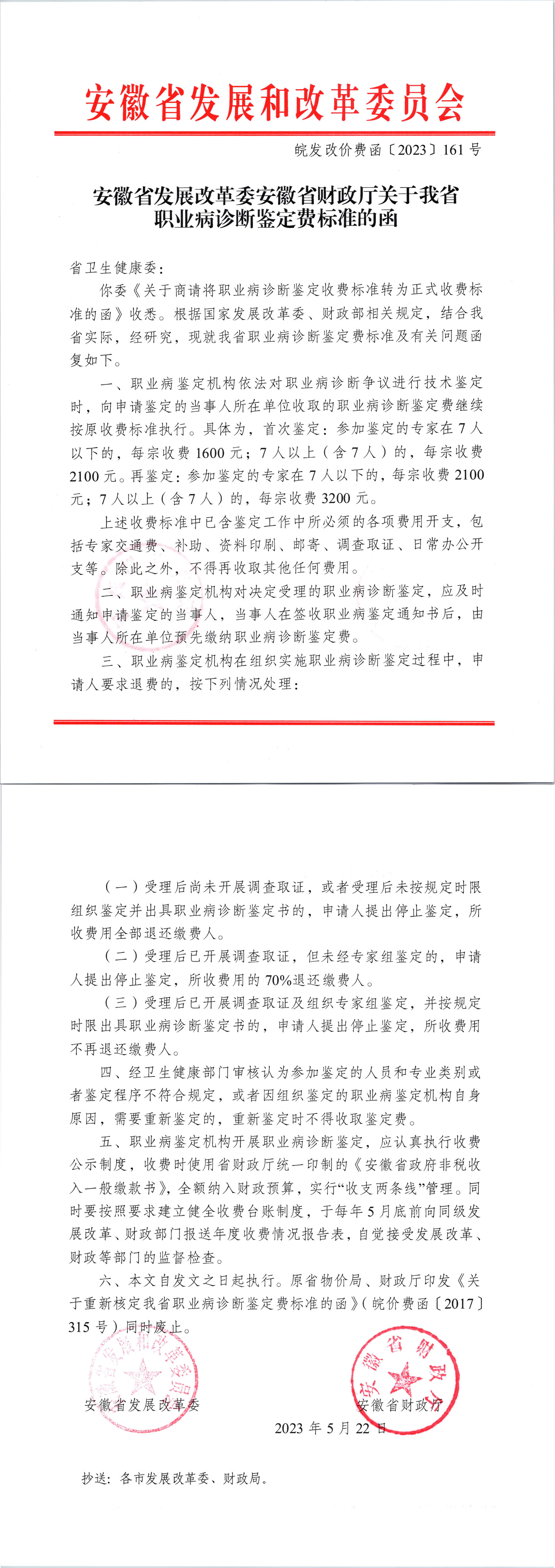 安徽省发展改革委安徽省财政厅关于我省职业病诊断鉴定费标准的函