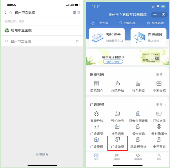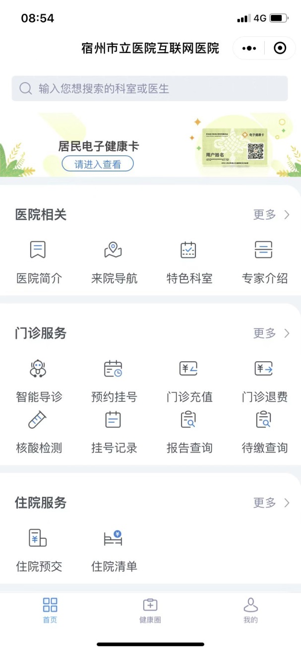 1、门诊费用查询(缴费前查询):打开微信,搜索“宿州市立医院”小程序,在“门诊服务”项目下选择“门诊缴费”,选择就诊人员,选择就诊科室,即可查询所需缴费金额。