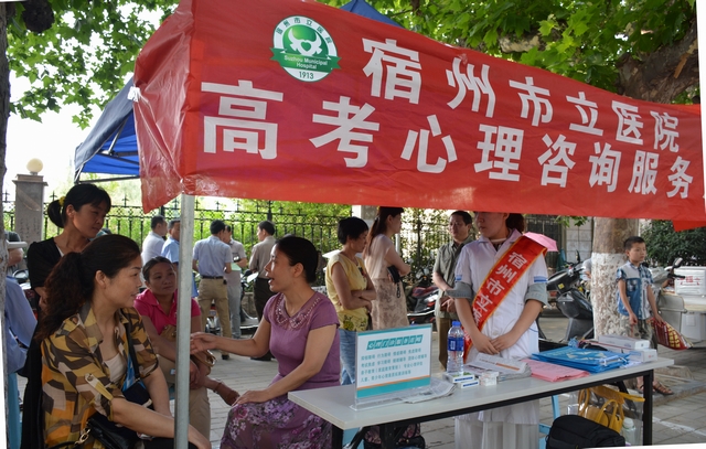 今年高考,宿州市立医院在全市四大考区设立“高考心理咨询服务点”。分别是:“一中”、“第一初级中学”、“二中”、“十一中”四个考区,各考区都安排两名心理咨询师、医护人员、特需药品(如:清凉油、藿香正气水等)。心理咨询师对考生,进行心理疏导,并且为考生家长提供心理咨询,同时对各考区考生发生意外时,进行急救处理。我院在四大考区设立的“高考心理咨询服务点”帮助考生以更好的状态投入考试,让考生和家长们在炎炎夏日感受到清凉关怀。