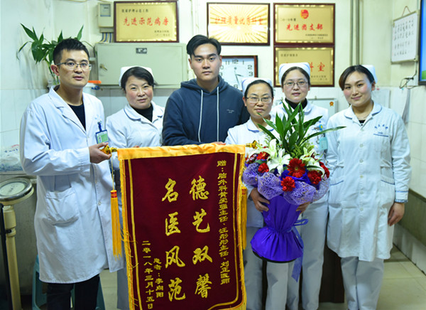 四十二岁的李先生因车祸致重度颅脑损伤、脑疝,深度昏迷,随时都有失去生命的可能。神经外科副主任医师黄爱强,医师汪彤彤、刘正与医护人员全力抢救病人,急诊行前开颅脑内血肿清除+有创颅内压监护术,展开了一场生命与时间的搏斗,最终李先生脱离了生命危险。李先生的儿子激动的说:非常感谢神经外科的医护人员抢救了父亲的生命,在住院的50多天里,医护人员关怀备至,精心护理,尤其在春节期间,让我们全家感受到亲人般的呵护,家一般的温暖。“手术后的恢复前期,父亲情绪比较焦躁,不是特别配合治疗,有时候一天能呼叫医护人员三四十次,但每次他们前来都非常有耐心,并告诉我们这属于术后的症状,抚慰父亲的情绪。到恢复中后期,父亲情绪终于平稳,从不愿意到主动配合治疗,再到治愈出院。谢谢神经外科医护人员!谢谢!。”