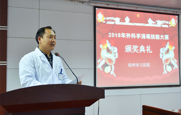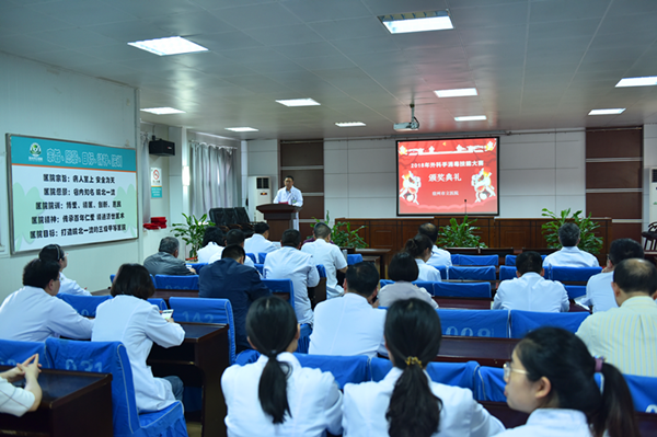 表彰会上,医务科副科长朱峰向大家宣读了《关于组织表彰2018年度外科手消毒技能大赛获奖个人及科室的通报》,其中一等奖一名、二等奖两名、三等奖三名、优秀奖十余名及团体奖项若干,副院长陈军为获奖者颁奖。