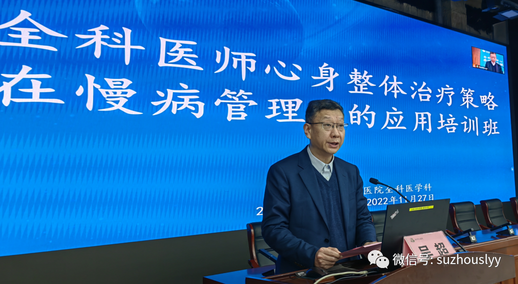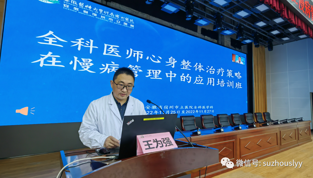 为进一步完善和提高全科医师心身整体医疗的诊疗水平,促进心身整体化诊疗的学习交流,强化全科医生在慢病管理中的心身疾病认知与应对能力,提升基层医疗卫生服务能力,助力分级诊疗制度落实。2022年11月25日至11月27日,由我院举办的国家级继续医学教育项目“全科医师心身整体治疗策略在慢病管理中的应用培训班”在我院顺利召开。本次会议由全科医学科科主任王为强主持,按照疫情防控工作要求,采用线上、线下相结合的方式举行。