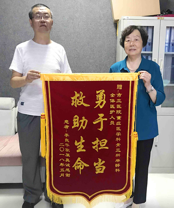 5月18日上午, 一面写有“勇于担当 、救助生命”的鲜红锦旗送到宣传科。送锦旗的是母子二人,患者儿子称老父亲身患重病得到我院重症监护室、骨三科、麻醉科共同协作、精准救治,向我院表示深深谢意。
