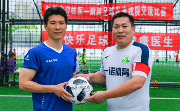 赛场上:双方队员本着“友谊第一、比赛第二”的精神,在球场上你来我往,你拼我搏,精彩的射门,激烈的身体对抗。赛场热火朝天,引得赛场内外加油声、欢呼声此起彼伏。经过激烈角逐,最终双方2比2 握手言和,本次与蚌医一附院之间的活动不仅进一步增进了二院之间的情感交流,队员们也在比赛中收获了友谊,更为我院文化建设增添了浓墨重彩的一笔。