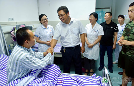 8月9日医务科科长、护理部主任等相关科室负责人在副院长陈军的带领下手捧鲜花再次看望这位救援英雄,对他的事迹表示满满的感动,曹磊却笑着说:“作为一名消防员,保障人民生命安全是我们的责任,更是一种担当,感谢医院对我的救护和关心,你们才是最棒的!”。