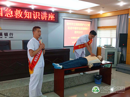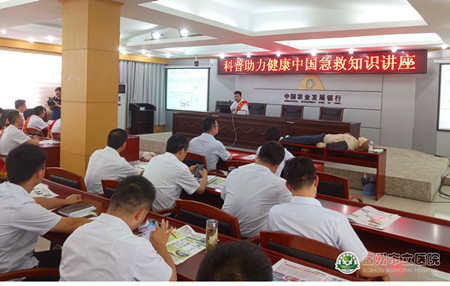 健康,是幸福的起点,也是成长的前提;是全面建成小康社会的重要内涵,也是人类社会发展福祉的永续追求。各种急危重症、意外伤害时有发生,威胁着人们的生命和健康, 意外伤害已成为危害人类健康的全球性公共卫生问题。急救不仅仅是专业急救医务人员的责任,掌握现场急救的技术也是非常重要不可忽视的,需要我们每个人都去认真学习并掌握。7月27日,宿州市立医院男护士之家携手市立医院青年志愿者走进中国农业发展银行宿州分行开展了科普助力.健康中国急救知识讲座,全行100余人参加。