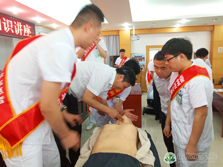 现场演示:理论知识讲授结束之后,男护士之家孙伟老师、刘恋老师进行了现场心肺复苏分解动作解说及演示,演示后并让中国农业发展银行宿州分行职工分组进行了现场模拟操作,市立医院青年志愿者们有序发放急救知识宣传手册,现场反映热烈,全行员工积极提问,并纷纷表示这次讲座让自己受益匪浅学到常用的急救知识,又能掌握基本的急救技能和日常简单的护理方法。以便在万一发生不测时,用救死扶伤的一片爱心,实行有效的急救方法。"救人一命,胜造七级浮屠"在这里也许就能体现。