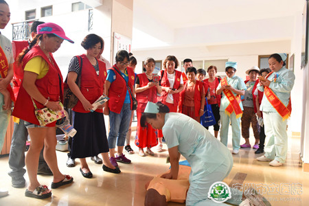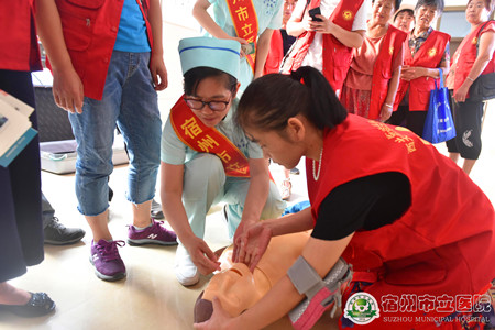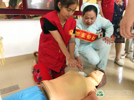 急诊科马影护士长亲自为他们讲解演示心肺复苏术操作流程:确保现场安全—判断意识—呼救求助—胸外按压—开放气道—人工呼吸—重新评价生命指征,特别邀请志愿者现场进行练习操作,使志愿者们轻松掌握心肺复苏法的操作技能,活动中,市立医院急诊科优秀骨干发放急救宣传手册,向志愿者进行急救知识宣传,现场反映热烈,社区的志愿者们纷纷表示这次讲座让自己受益匪浅学到常用的急救知识,又能掌握基本的急救技能和日常简单的护理方法。更好的为社区居民服务,为身边需要的人伸出援助手,献出一片爱心。