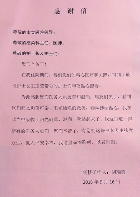 患者胡某,男,67岁,因慢性乙肝和上消化道出血入院,住院期间医生每日数次查房查看病人情况,护理人员细心观察病情变化,精心护理、耐心周到,并对患者和家属进行心理疏导,减轻压力,消除焦虑情绪。经过十几天的专业治疗,病情逐渐好转,各项体征指标正常、情况稳定,达到出院标准。患者和家属为感谢感染性疾病科室医疗和护理团队的专业治疗和精心照顾,特意写下感谢信,深表感谢。