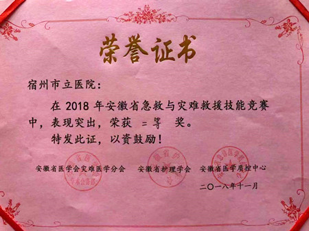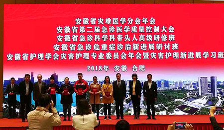 11月2日,安徽省急诊质控中心,安徽省灾难医学分会,安徽省护理学会联合主办的“2018年安徽省急救与灾害救援技能竞赛”在合肥举行,全省38支代表队,共150余名医护精英参加,比赛包括理论和技能两个方面,着重考察医护人员的急救与灾害现场救援技术及团队协作能力。我院急诊科护士长马影、唐慧娟,医生张友红、王泉松组成的宿州市立医院代表队努力拼搏,荣获竞赛二等奖。